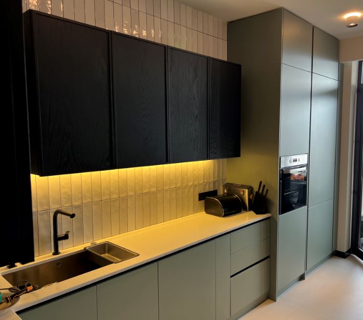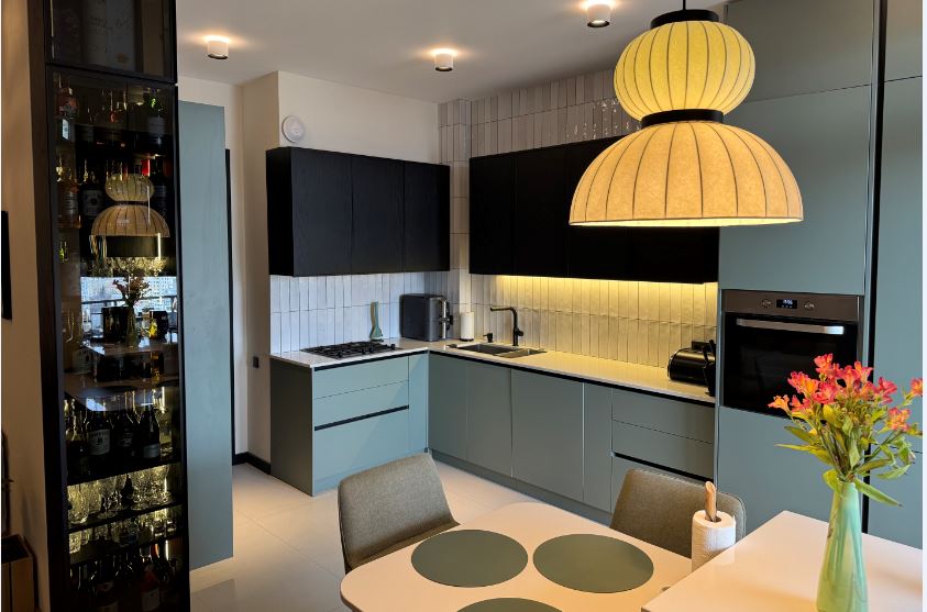 სამზარეულო დამუქებული მუხის შპონით, გოლა საეხელურით სენსორული განათება დიმერზე, ჩაშენებული მაცივარი და სარეცხი მანქანა.